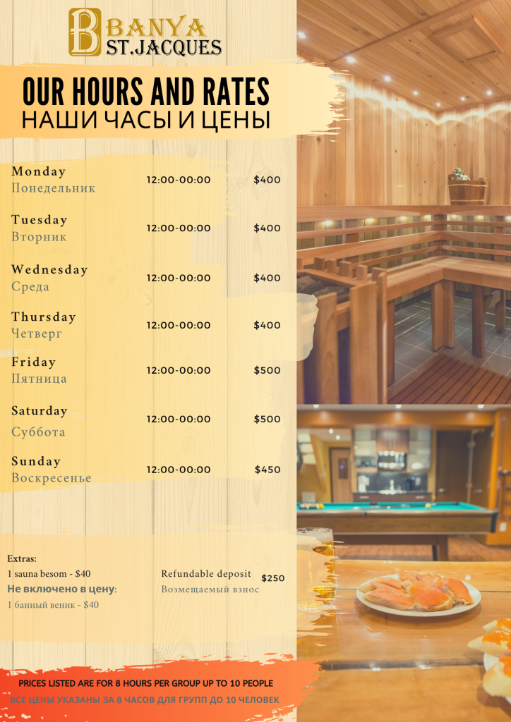 Banya St.Jacques offers an exceptional experience for an affordable price. The whole sauna facility is rented out for a period of up to 8 hours for your private use. For your convenience, you can choose any 8-hour time slot between 12:00 and 00:00.